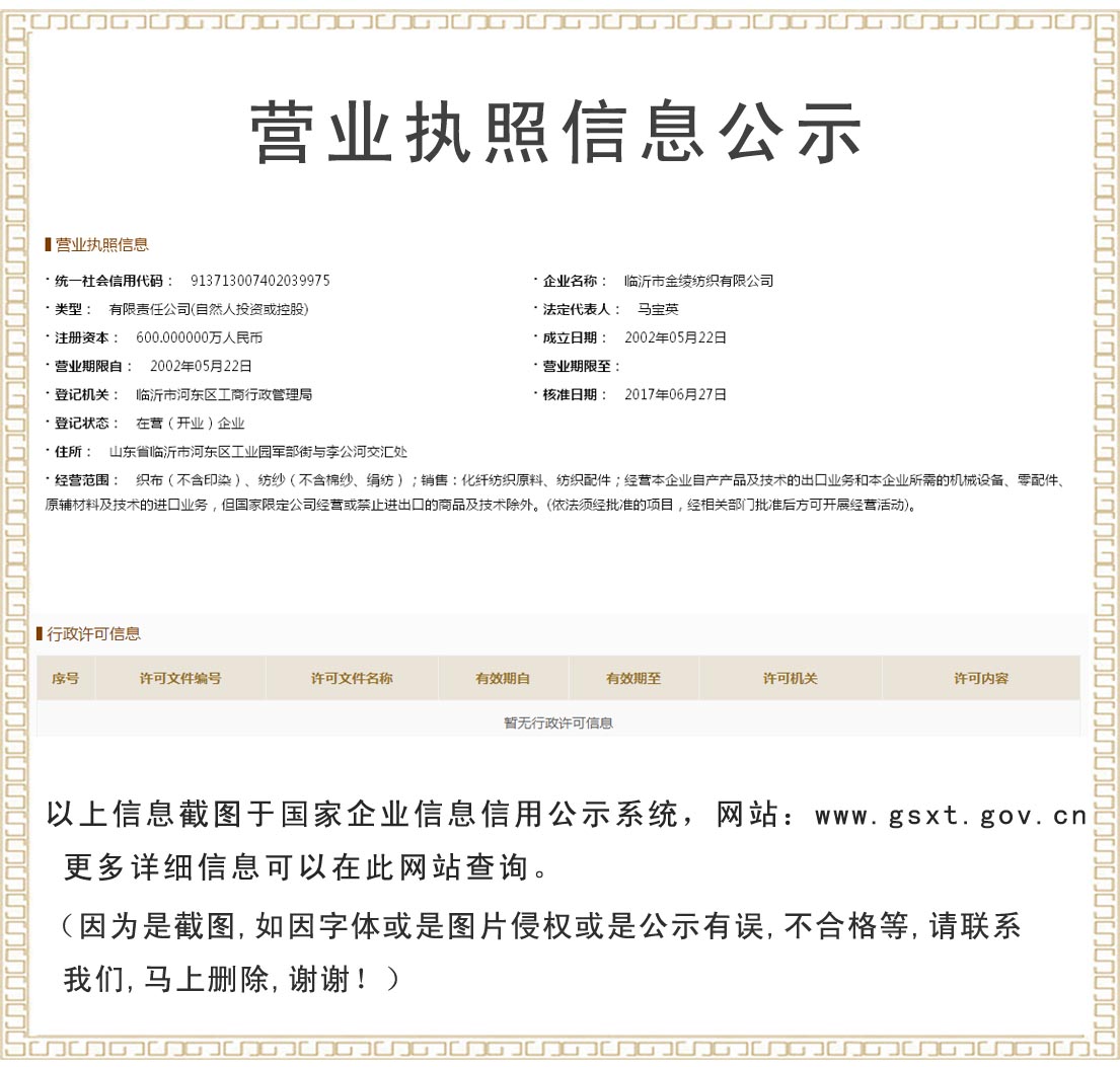 臨沂市金綾紡織有限公司始建于1978年,前身為臨沂市第四棉織廠(chǎng),是我市老字號(hào)知名紡織企業(yè)。公司位于中國(guó)物流名城——山東省臨沂市,毗鄰青島、日照、連云港等港口,京滬,長(zhǎng)深,日蘭等高速。市內(nèi)緊靠高鐵臨沂北站、臨沂機(jī)場(chǎng)等,交通便利,區(qū)位優(yōu)勢(shì)突出。公司建設(shè)完成高標(biāo)準(zhǔn)廠(chǎng)房10萬(wàn)平方米,研發(fā)中心等2萬(wàn)平方米,現(xiàn)有員工300余人,其中專(zhuān)業(yè)技術(shù)人員150人。